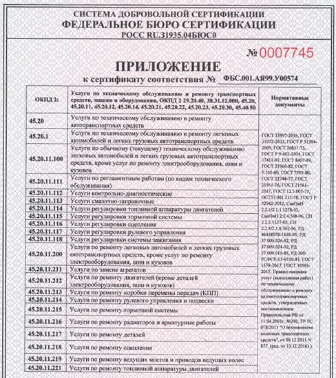 Сертификат автосервиса для проведения самых популярных работ на всех типах транспортных средств.